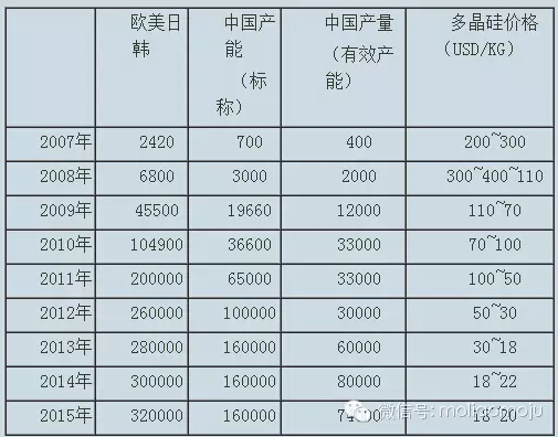 从上表可以看出,2007年到2014年,中国多晶硅产量也飞速增长,从每年数百吨达到了16万吨的年产能。多晶硅产能快速扩张的原因,主要就是2008年的由于光伏产业需求的猛增造成国际多晶硅价格暴涨刺激所致。截至2013年,中国有60家企业先后从事多晶硅生产,投产规模达到7万吨/年,建设规模则达到了16万吨。同年,国内产量达到70000吨,但需求量却超过18万吨,进口达11万吨,进口量将近60%。