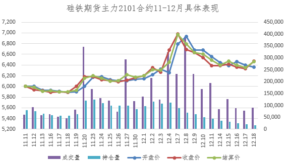 【期货行情】本周硅铁期货2101主力合约盘面总体下行。周开盘价6,440,最高价6,566,最低价6,308,收盘价6,472,结算价6,464,成交量467,900,持仓量17,455,涨幅-0.28%。