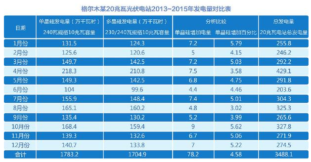 “正常情况下(不受限电影响),10兆瓦单晶硅光伏方阵2013~2015年3年发电量较10兆瓦多晶硅光伏方阵发电量增加78.2万千瓦时,单晶硅较多晶硅发电量可高出4.58%。”近日,一组青海格尔木20兆瓦光伏电站的运行数据出炉,由组件差异决定的光伏电站系统效率的提升得出的结论。 |