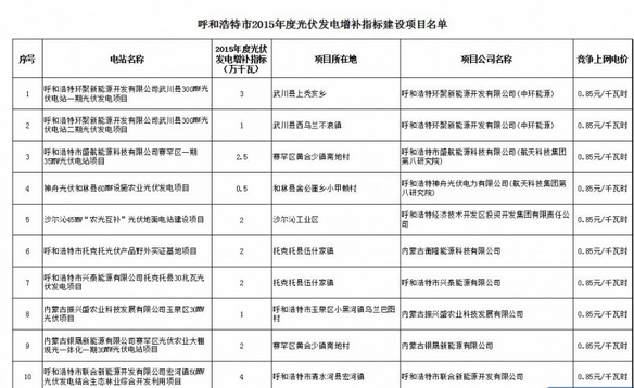 呼市发改委公示2015年光伏竞价上网项目名单