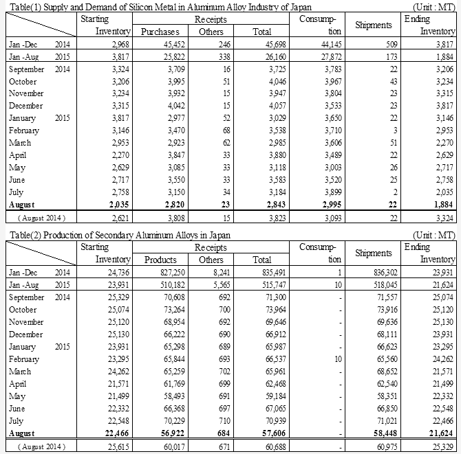 中国铁合金网讯:由于夏季铝产品生产量下滑,因此金属硅的消费量和可再生铝合金生产量都下降,而8月份数据亦显示消费量和产量大幅度下降,由于2009年8月份雷曼冲击带来的影响,今年8月份生产量和消费量均低于历史同期水平。具体细节如下表格所示: |