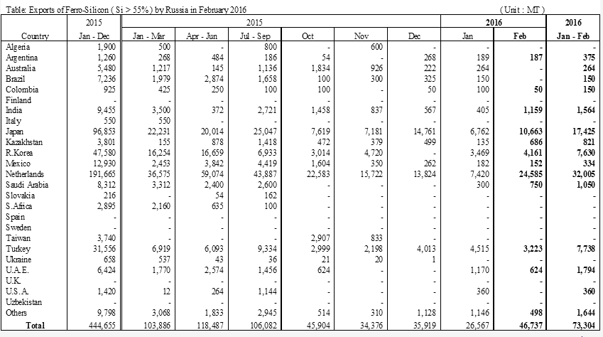 [Ferro-Alloys.com]Russia's customs statistics shows the export result of standard ferro-silicon (Si >55%) in February 2016 was 46,737 tons, drastically up by 75.9% from 26,567 tons in the prior month.